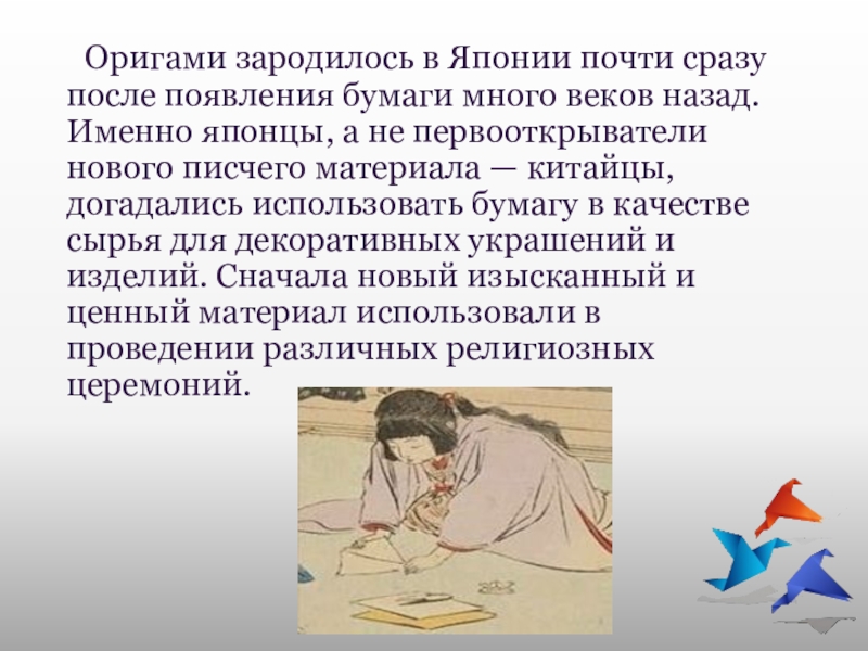 Слайд 3 Оригами зародилось в Японии почти сразу после появления бумаги много