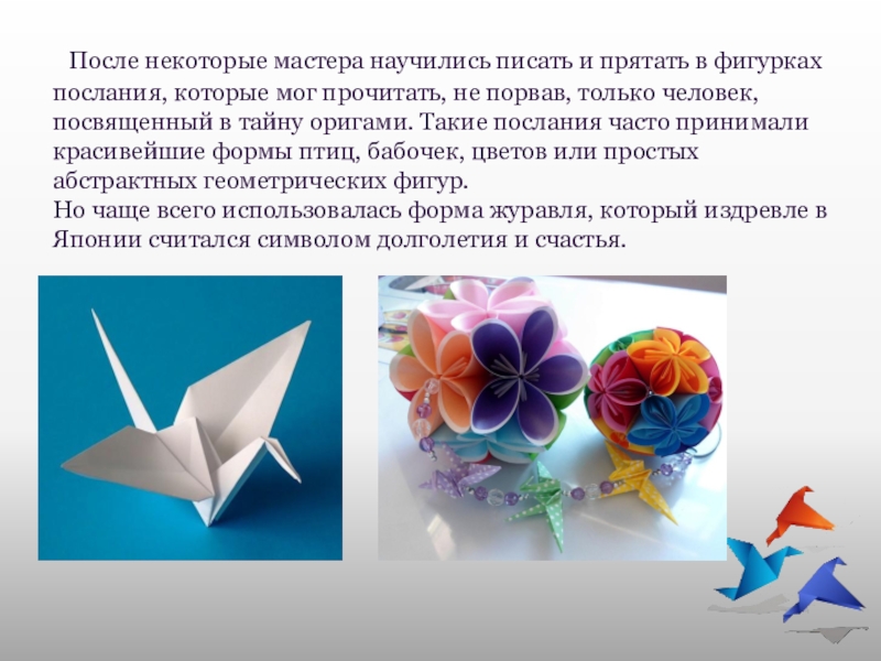 которые мог прочитать, не порвав, только человек, посвященный в тайну оригами. Такие послания часто принимали красивейшие формы птиц, бабочек, цветов или простых абстрактных геометрических фигур. Но чаще всего использовалась форма журавля, который издревле в Японии считался символом долголетия и счастья.