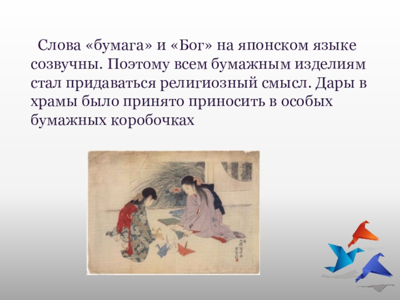 Слайд 4 Слова «бумага» и «Бог» на японском языке созвучны. Поэтому всем