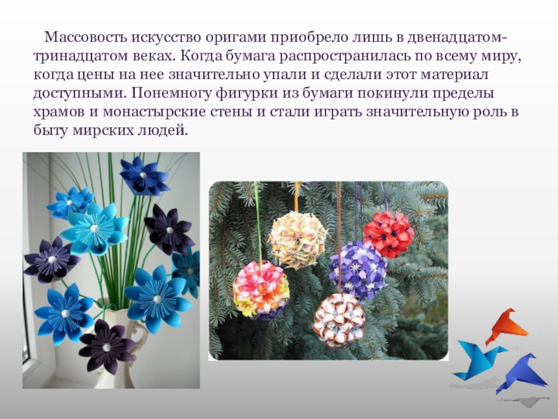 Слайд 8 Массовость искусство оригами приобрело лишь в двенадцатом-тринадцатом веках. Когда