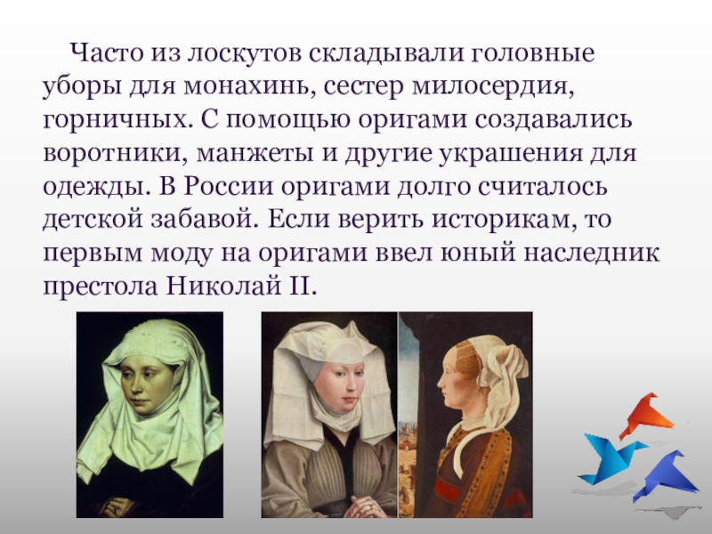милосердия, горничных. С помощью оригами создавались воротники, манжеты и другие украшения для одежды. В России оригами долго считалось детской забавой. Если верить историкам, то первым моду на оригами ввел юный наследник престола Николай II.