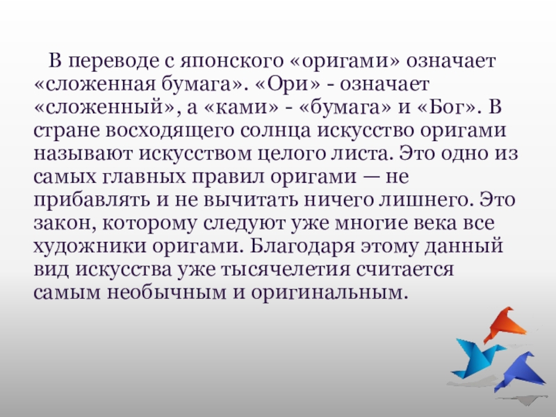- означает «сложенный», а «ками» - «бумага» и «Бог». В стране восходящего солнца искусство оригами называют искусством целого листа. Это одно из самых главных правил оригами — не прибавлять и не вычитать ничего лишнего. Это закон, которому следуют уже многие века все художники оригами. Благодаря этому данный вид искусства уже тысячелетия считается самым необычным и оригинальным.