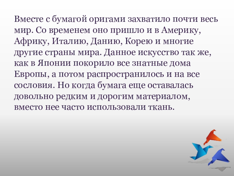 Слайд 9Вместе с бумагой оригами захватило почти весь мир. Со временем оно