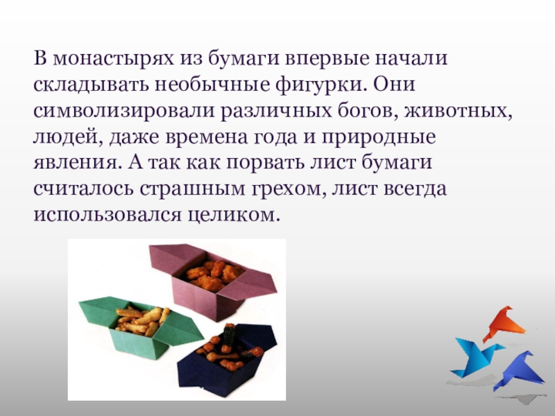 Слайд 5В монастырях из бумаги впервые начали складывать необычные фигурки. Они символизировали