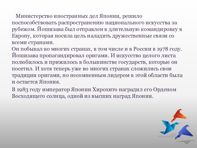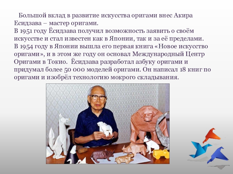 Слайд 11 Большой вклад в развитие искусства оригами внес Акира Есидзава