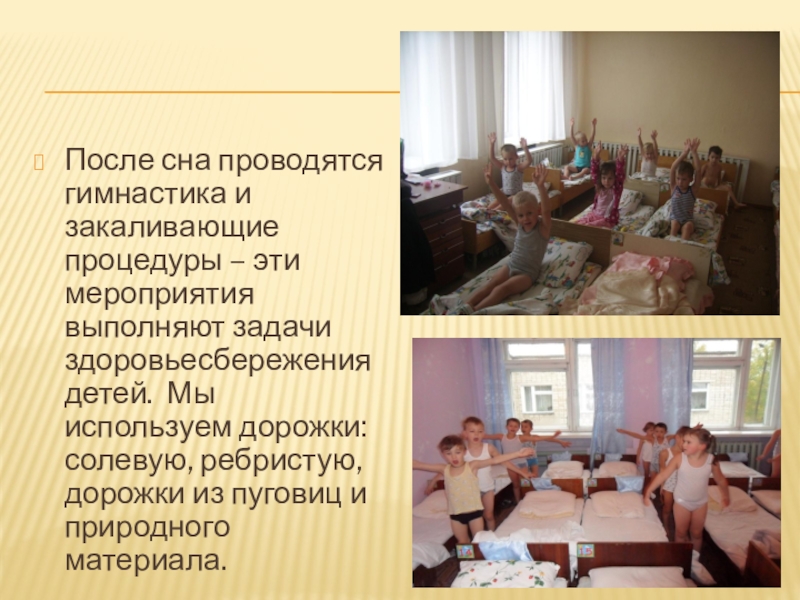 Слайд 9После сна проводятся гимнастика и закаливающие процедуры – эти мероприятия выполняют