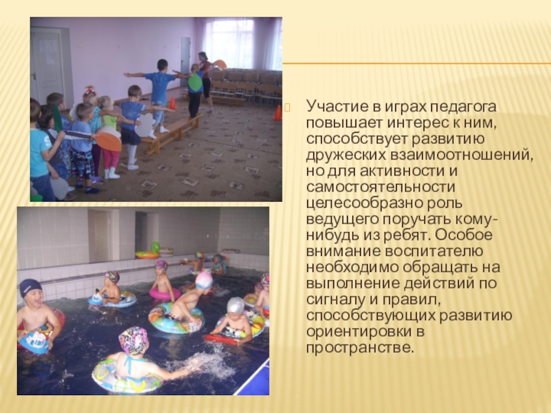 Слайд 7Участие в играх педагога повышает интерес к ним, способствует развитию дружеских