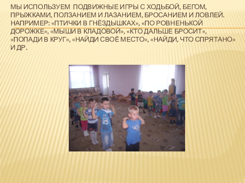 Слайд 6Мы используем подвижные игры с ходьбой, бегом, прыжками, ползанием и лазанием,