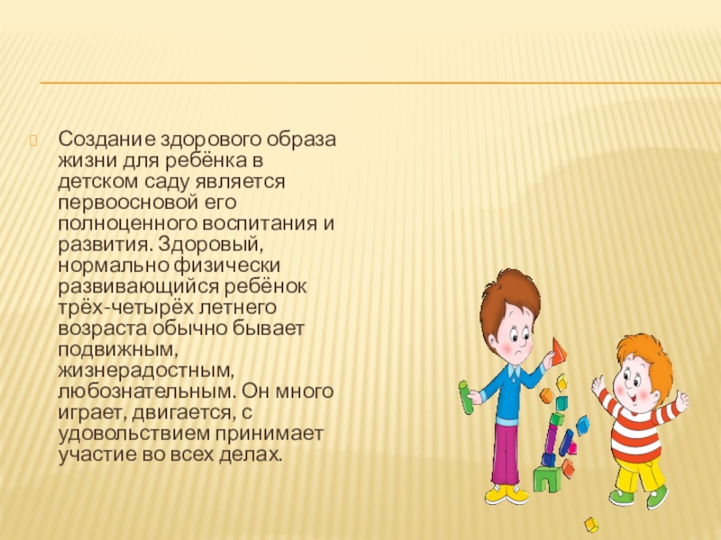 его полноценного воспитания и развития. Здоровый, нормально физически развивающийся ребёнок трёх-четырёх летнего возраста обычно бывает подвижным, жизнерадостным, любознательным. Он много играет, двигается, с удовольствием принимает участие во всех делах.