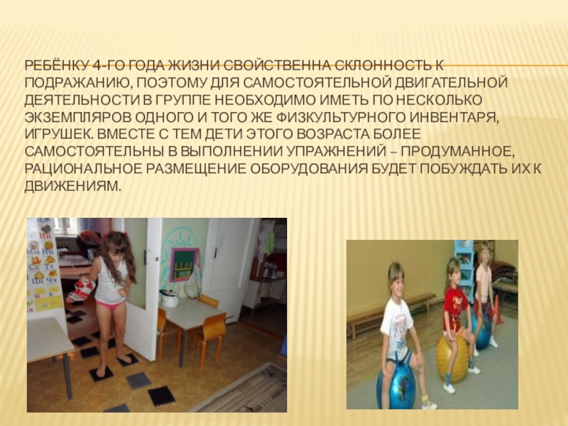двигательной деятельности в группе необходимо иметь по несколько экземпляров одного и того же физкультурного инвентаря, игрушек. Вместе с тем дети этого возраста более самостоятельны в выполнении упражнений – продуманное, рациональное размещение оборудования будет побуждать их к движениям.