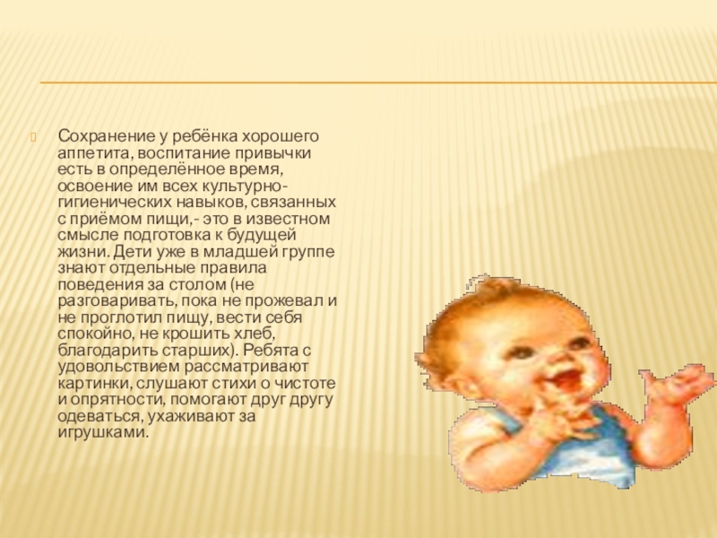 Слайд 4Сохранение у ребёнка хорошего аппетита, воспитание привычки есть в определённое время,
