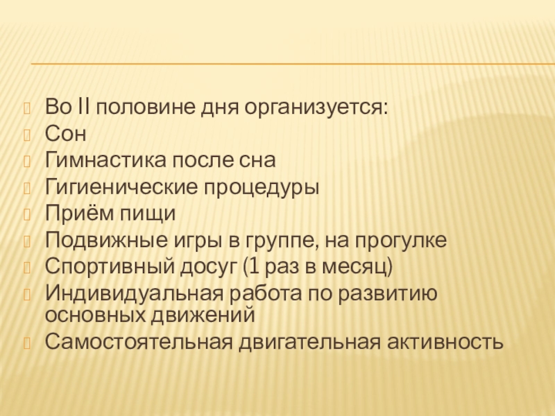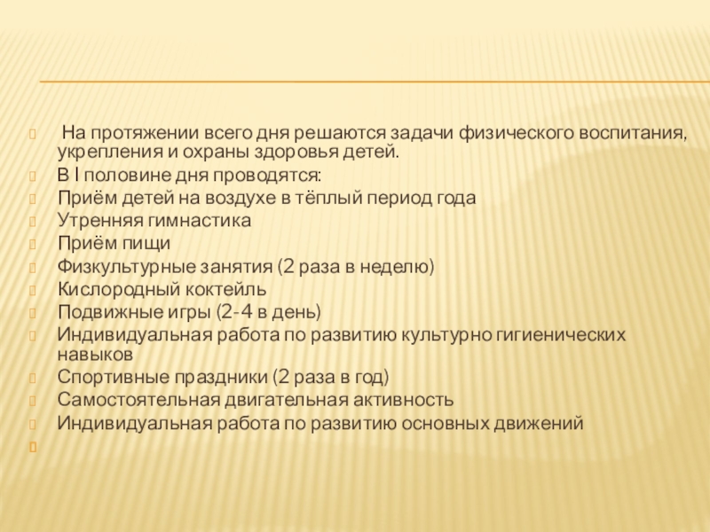 Слайд 11 На протяжении всего дня решаются задачи физического воспитания, укрепления и