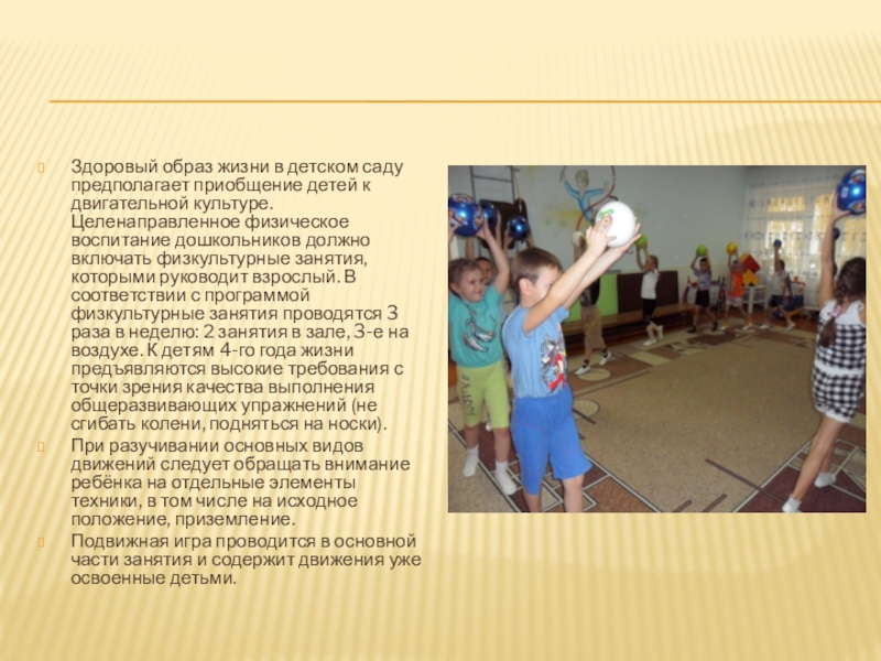 Слайд 8Здоровый образ жизни в детском саду предполагает приобщение детей к двигательной