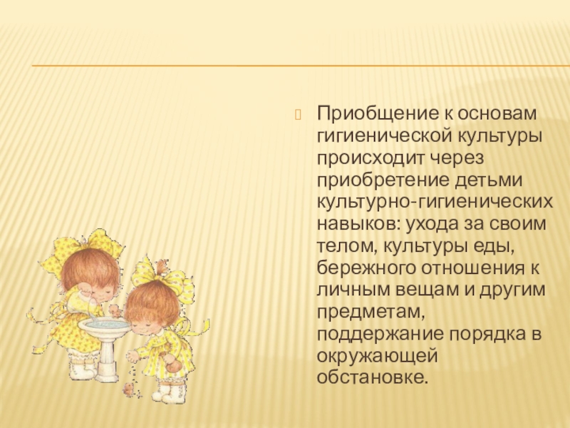 Слайд 3Приобщение к основам гигиенической культуры происходит через приобретение детьми культурно-гигиенических навыков: