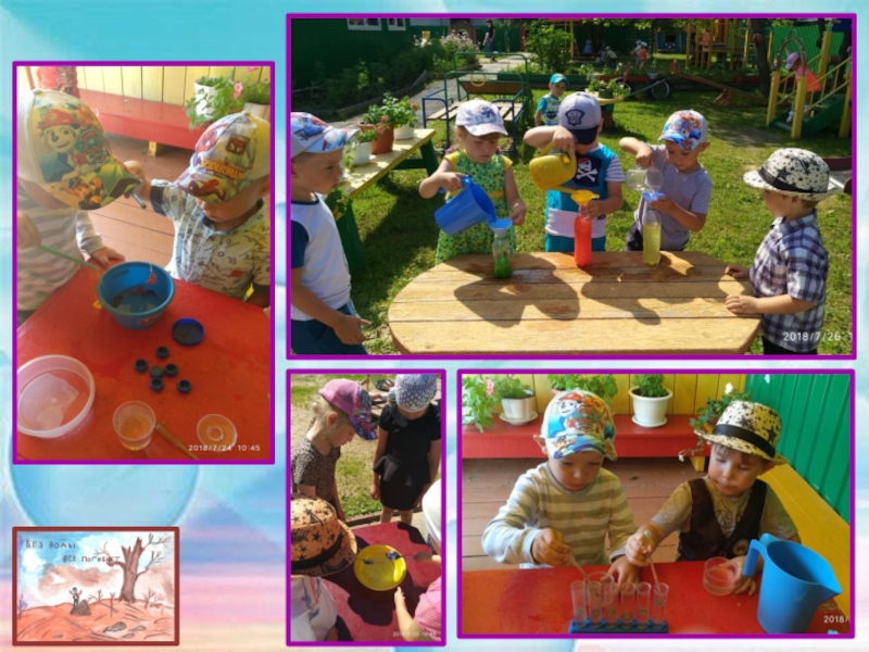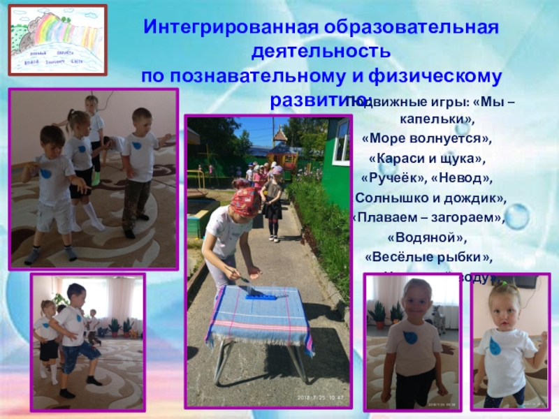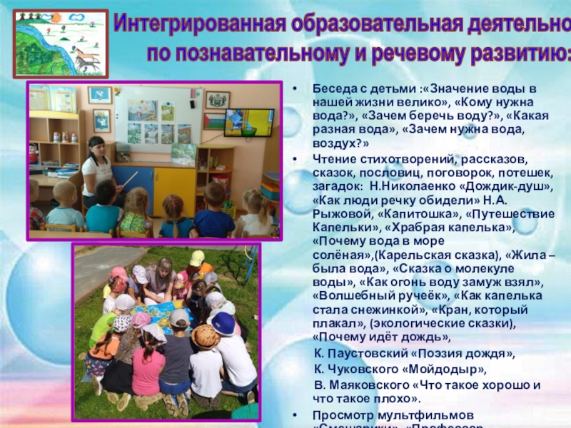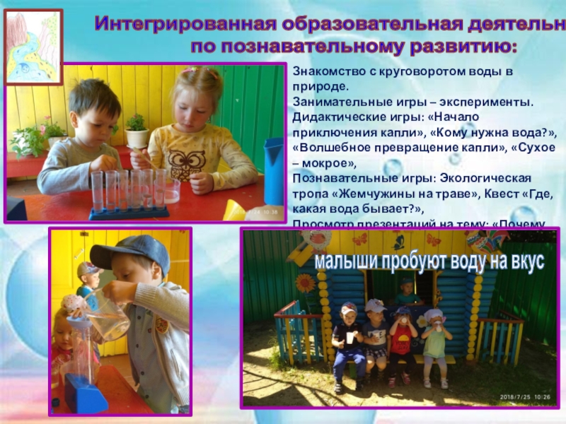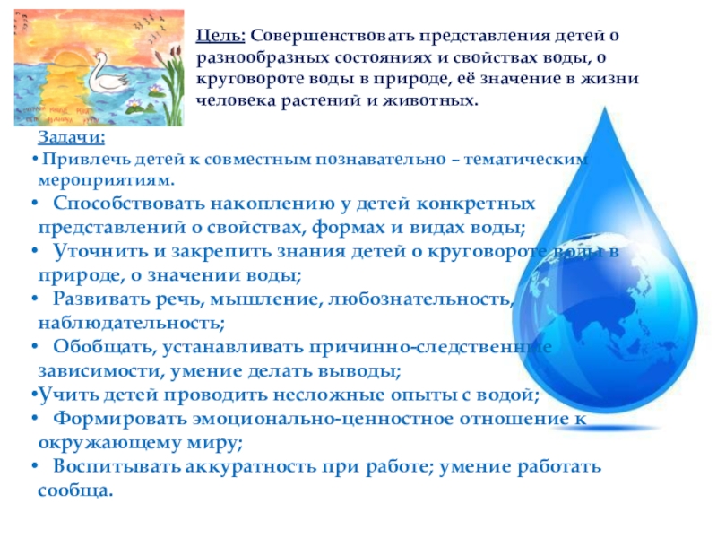 Способствовать накоплению у детей конкретных представлений о свойствах, формах и видах воды;