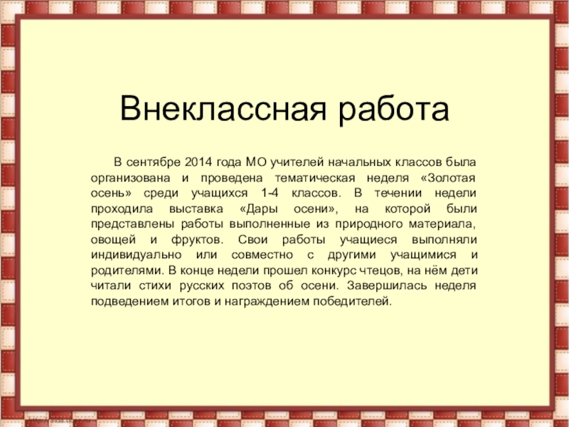 начальных классов была организована и проведена тематическая неделя «Золотая осень» среди учащихся 1-4 классов. В течении недели проходила выставка «Дары осени», на которой были представлены работы выполненные из природного материала, овощей и фруктов. Свои работы учащиеся выполняли индивидуально или совместно с другими учащимися и родителями. В конце недели прошел конкурс чтецов, на нём дети читали стихи русских поэтов об осени. Завершилась неделя подведением итогов и награждением победителей.