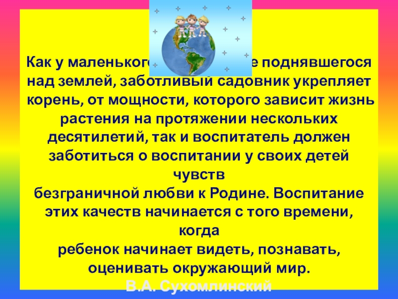 мощности, которого зависит жизнь растения на протяжении нескольких десятилетий, так и воспитатель должен заботиться о воспитании у своих детей чувств безграничной любви к Родине. Воспитание этих качеств начинается с того времени, когда ребенок начинает видеть, познавать, оценивать окружающий мир. В.А. Сухомлинский