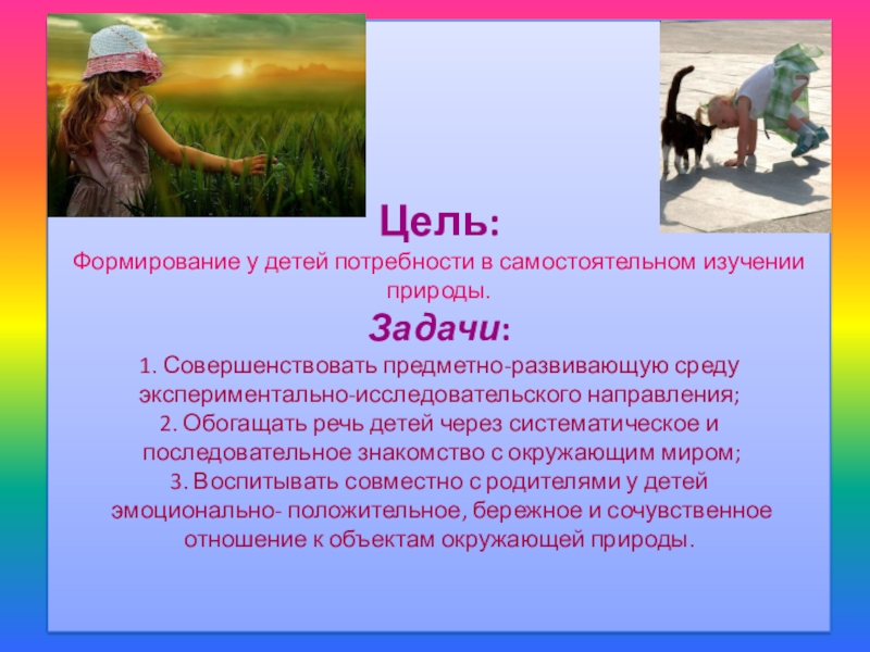 экспериментально-исследовательского направления; 2. Обогащать речь детей через систематическое и последовательное знакомство с окружающим миром; 3. Воспитывать совместно с родителями у детей эмоционально- положительное, бережное и сочувственное отношение к объектам окружающей природы.