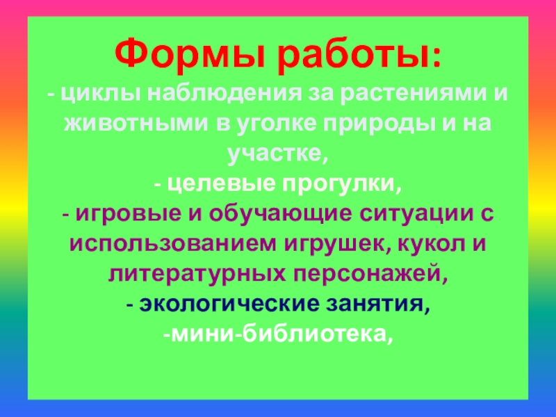 Слайд 8 Формы работы: - циклы наблюдения за растениями и животными в уголке природы