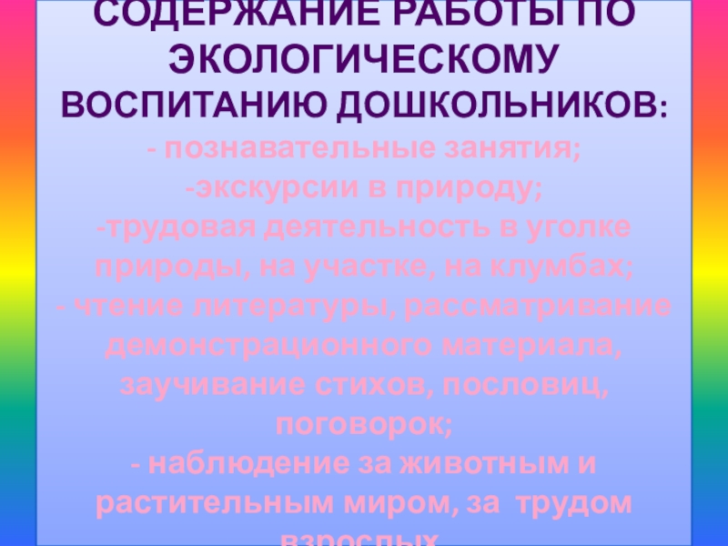 Слайд 9Содержание работы по экологическому воспитанию дошкольников: - познавательные занятия; -экскурсии в природу; -трудовая деятельность