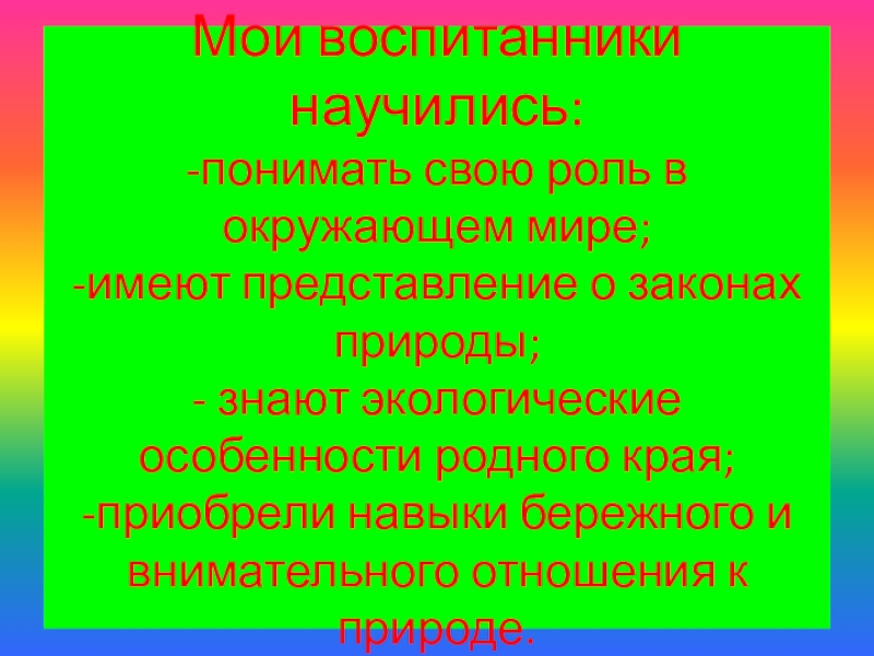 Мои воспитанники научились: -понимать свою роль в окружающем мире; -имеют представление о законах природы; - знают экологические