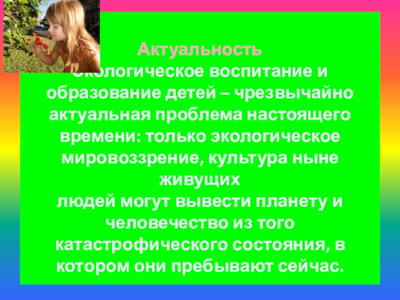 Слайд 6 Актуальность Экологическое воспитание и образование детей – чрезвычайно актуальная проблема настоящего времени: только экологическое мировоззрение, культура