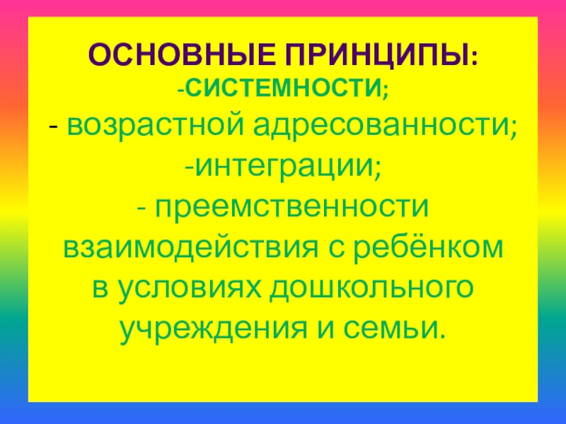 Слайд 10Основные принципы: -системности; - возрастной адресованности; -интеграции; - преемственности взаимодействия с ребёнком в условиях дошкольного