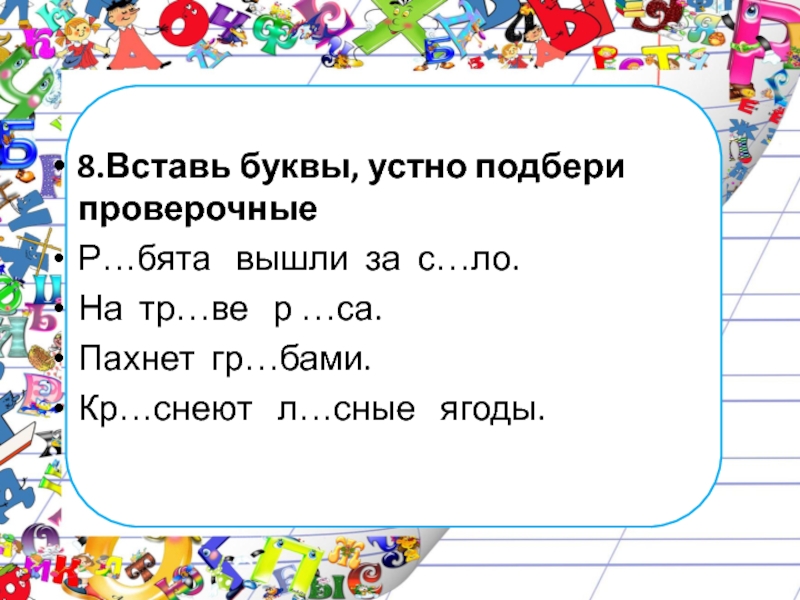 8.Вставь буквы, устно подбери проверочныеР…бята  вышли за с…ло.На тр…ве  р …са.Пахнет гр…бами.Кр…снеют  л…сные