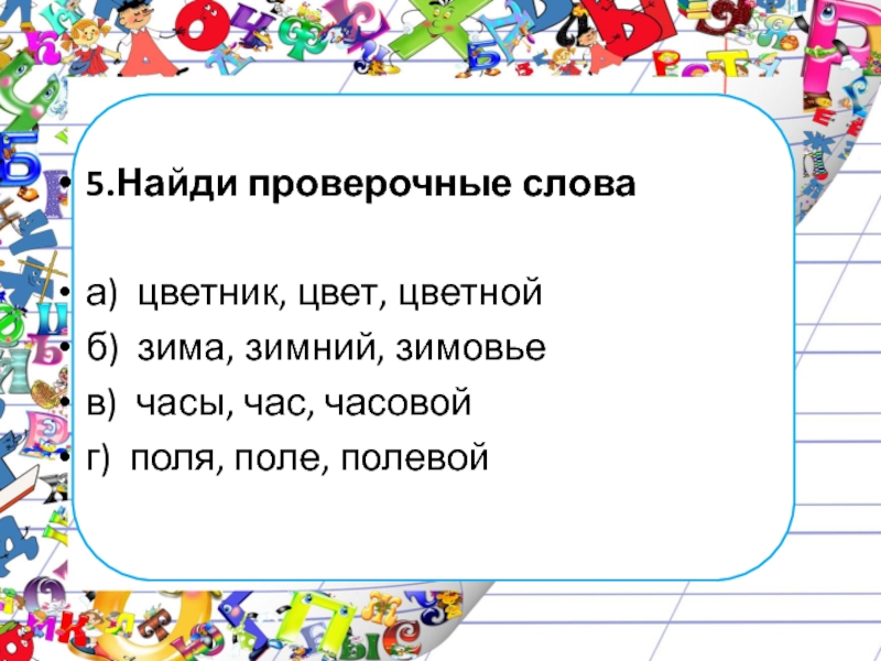 5.Найди проверочные словаа) цветник, цвет, цветнойб) зима, зимний, зимовьев) часы, час, часовойг) поля, поле, полевой