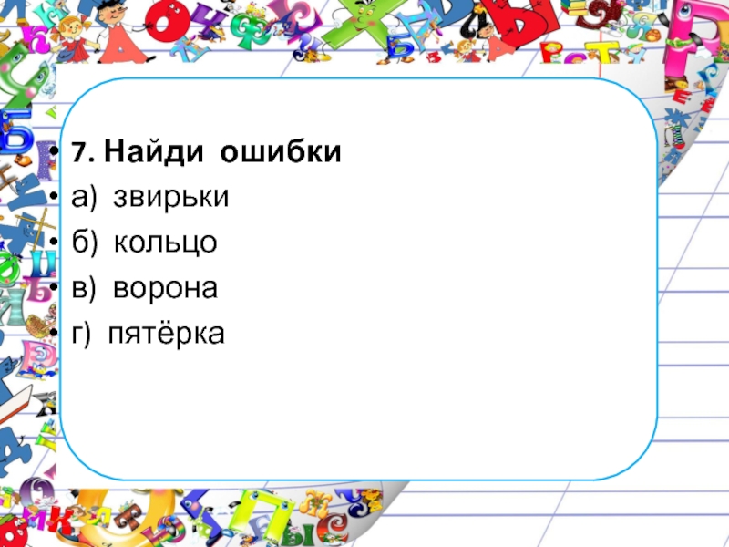 7. Найди ошибкиа) звирькиб) кольцов) воронаг) пятёрка