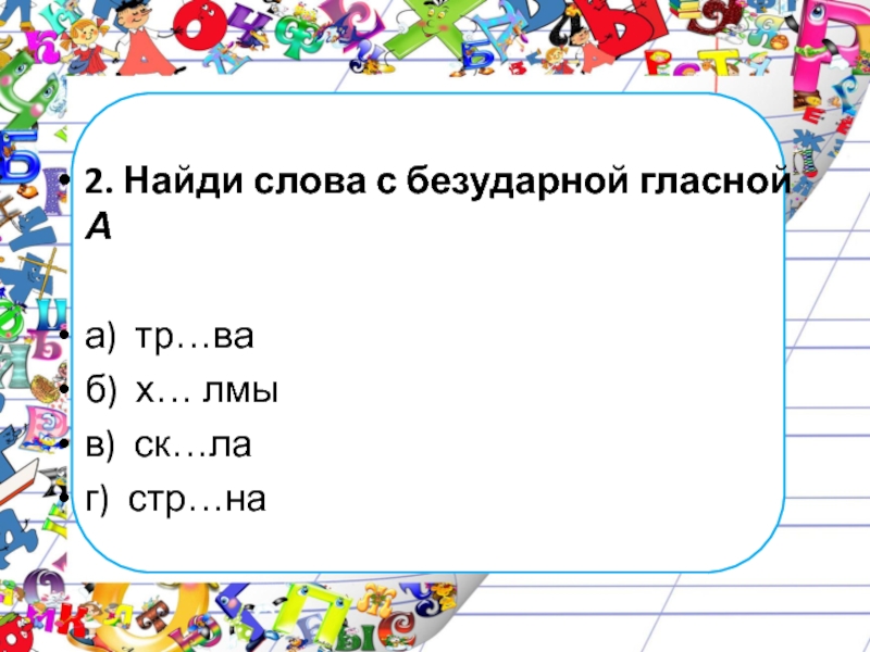 2. Найди слова с безударной гласной Аа) тр…ваб) х… лмыв) ск…лаг) стр…на