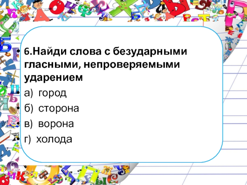 6.Найди слова с безударными гласными, непроверяемыми ударениема) городб) сторонав) воронаг) холода