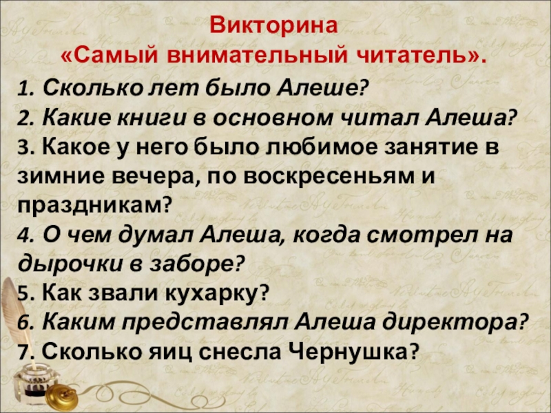 Викторина  «Самый внимательный читатель». 1. Сколько лет было Алеше? 2. Какие книги в основном читал Алеша?