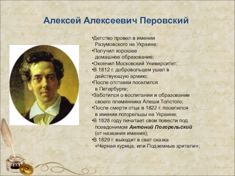 Алексей Алексеевич Перовский Детство провел в имении Разумовского на Украине;Получил хорошее домашнее образование;Окончил Московский Университет;В 1812 г.