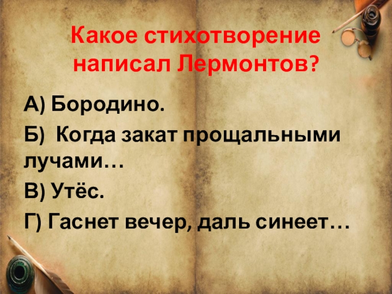 Какое стихотворение написал Лермонтов?А) Бородино.Б) Когда закат прощальными лучами…В) Утёс.Г) Гаснет вечер, даль синеет…
