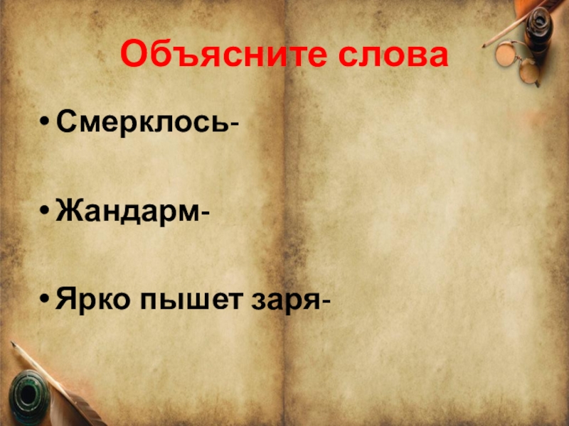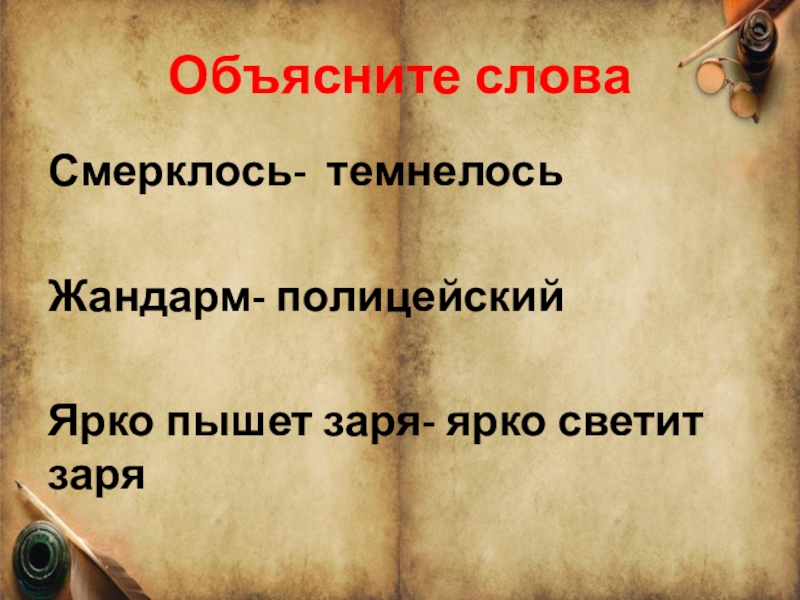 Объясните словаСмерклось-Жандарм-Ярко пышет заря-