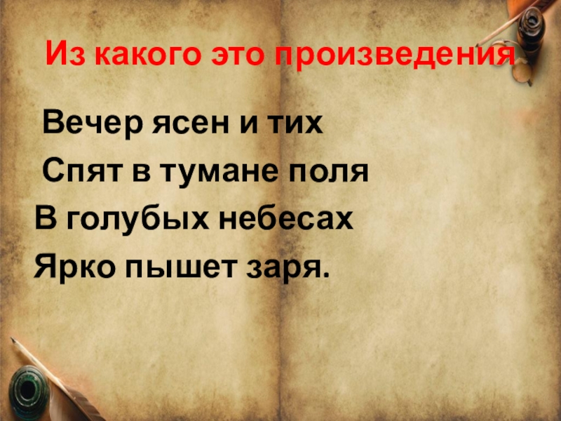 Из какого это произведения Вечер ясен и тих Спят в тумане поляВ голубых небесахЯрко пышет заря.