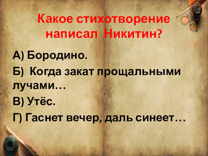 Какое стихотворение написал Никитин?А) Бородино.Б) Когда закат прощальными лучами…В) Утёс.Г) Гаснет вечер, даль синеет…