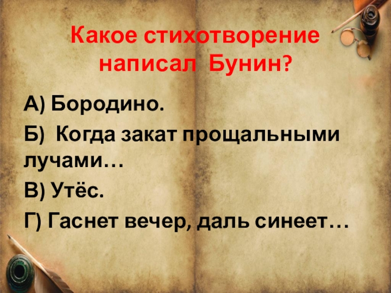 Какое стихотворение написал Бунин?А) Бородино.Б) Когда закат прощальными лучами…В) Утёс.Г) Гаснет вечер, даль синеет…