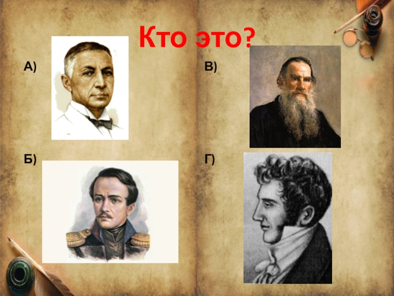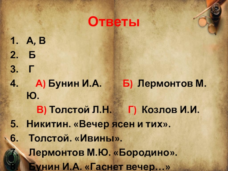 ОтветыА, В Б Г  А) Бунин И.А.     Б) Лермонтов М.Ю.