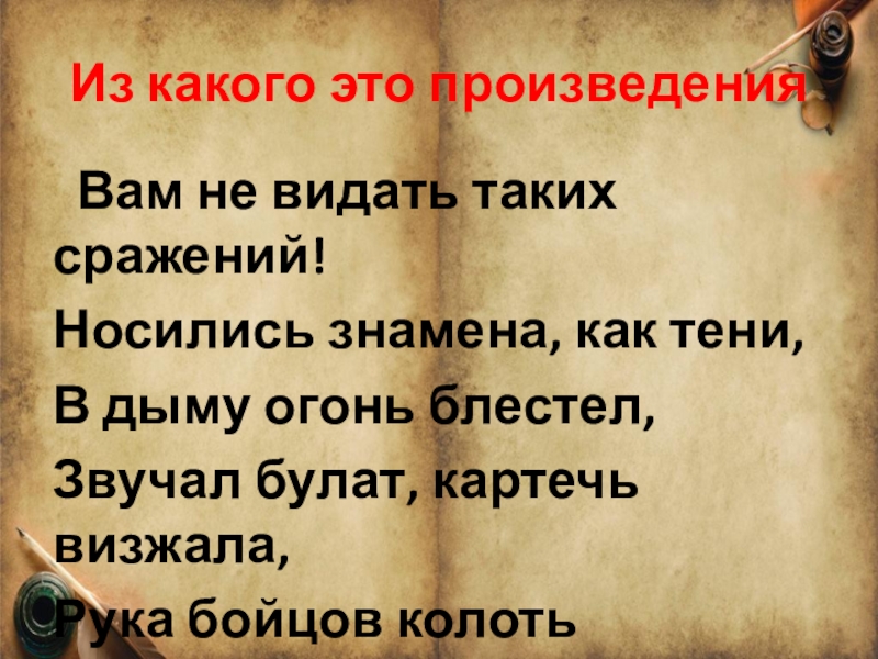 Из какого это произведения Вам не видать таких сражений!Носились знамена, как тени,В дыму огонь блестел,Звучал булат, картечь
