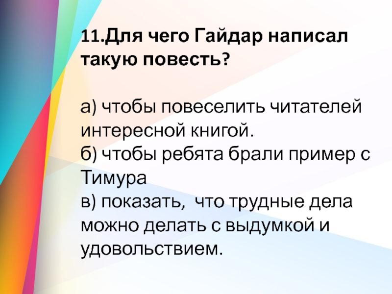 11.Для чего Гайдар написал такую повесть?а) чтобы повеселить читателей интересной книгой.б) чтобы ребята брали пример с Тимурав)