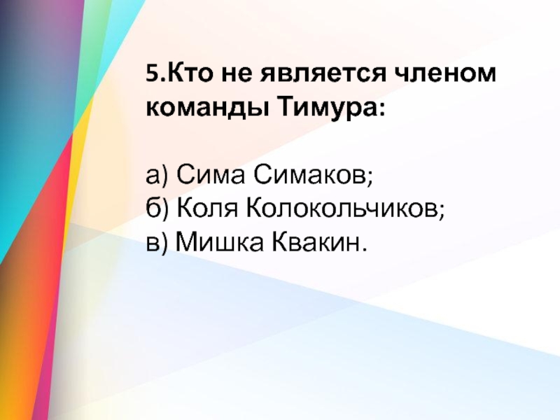 5.Кто не является членом команды Тимура: а) Сима Симаков;            б) Коля Колокольчиков;