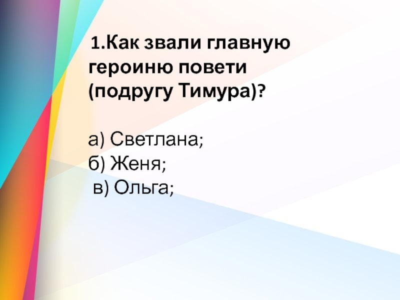 1.Как звали главную героиню повети (подругу Тимура)?а) Светлана;                    б) Женя;                    в) Ольга;