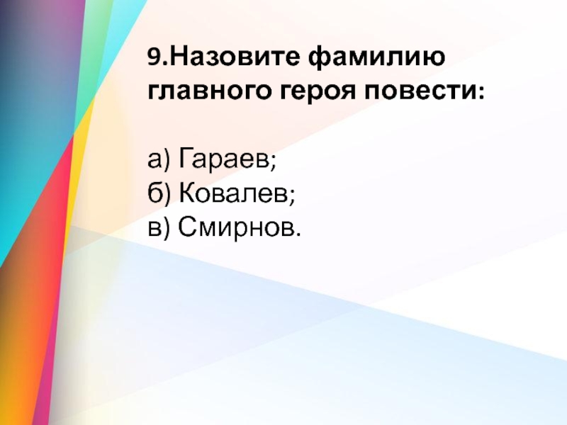 9.Назовите фамилию главного героя повести: а) Гараев;                б) Ковалев;