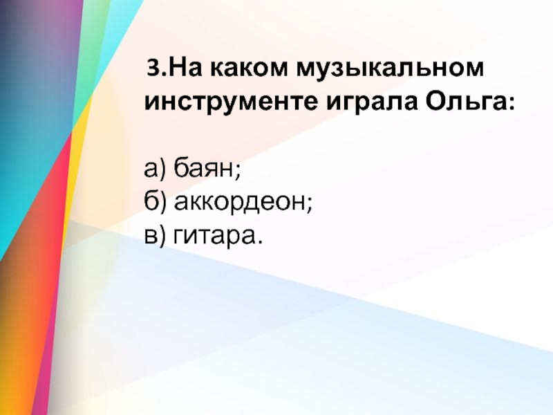3.На каком музыкальном инструменте играла Ольга: а) баян;            б) аккордеон;