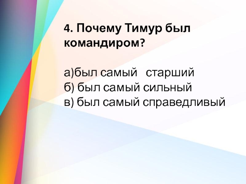 4. Почему Тимур был командиром?а)был самый   старший                 б)