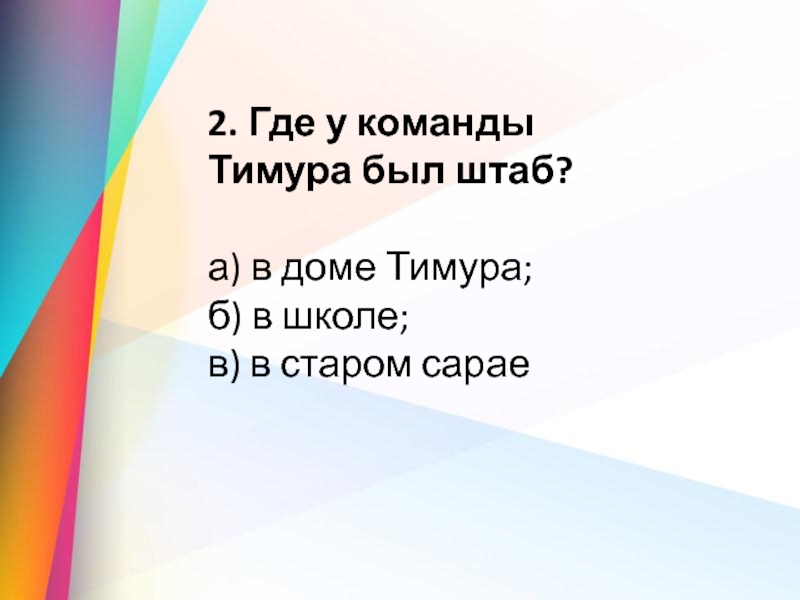 2. Где у команды Тимура был штаб?а) в доме Тимура;