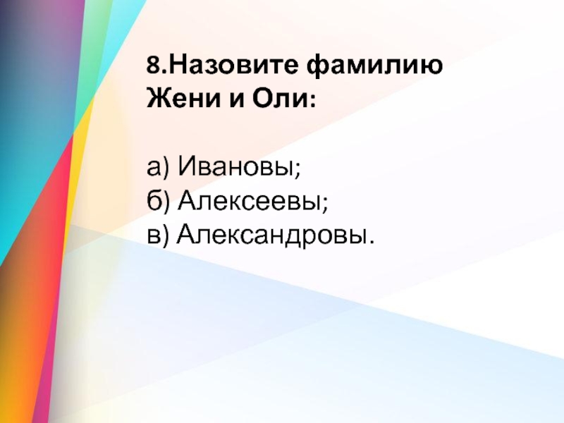 8.Назовите фамилию Жени и Оли: а) Ивановы;              б) Алексеевы;