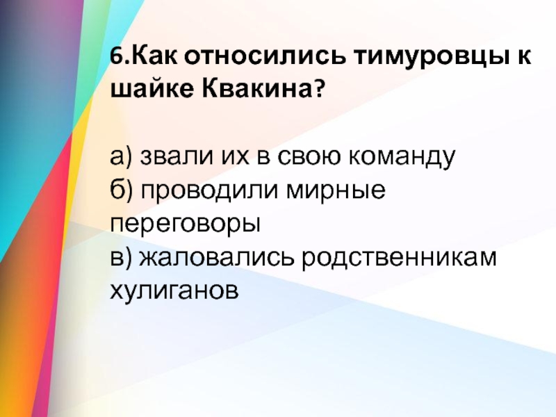 6.Как относились тимуровцы к шайке Квакина?а) звали их в свою команду